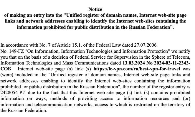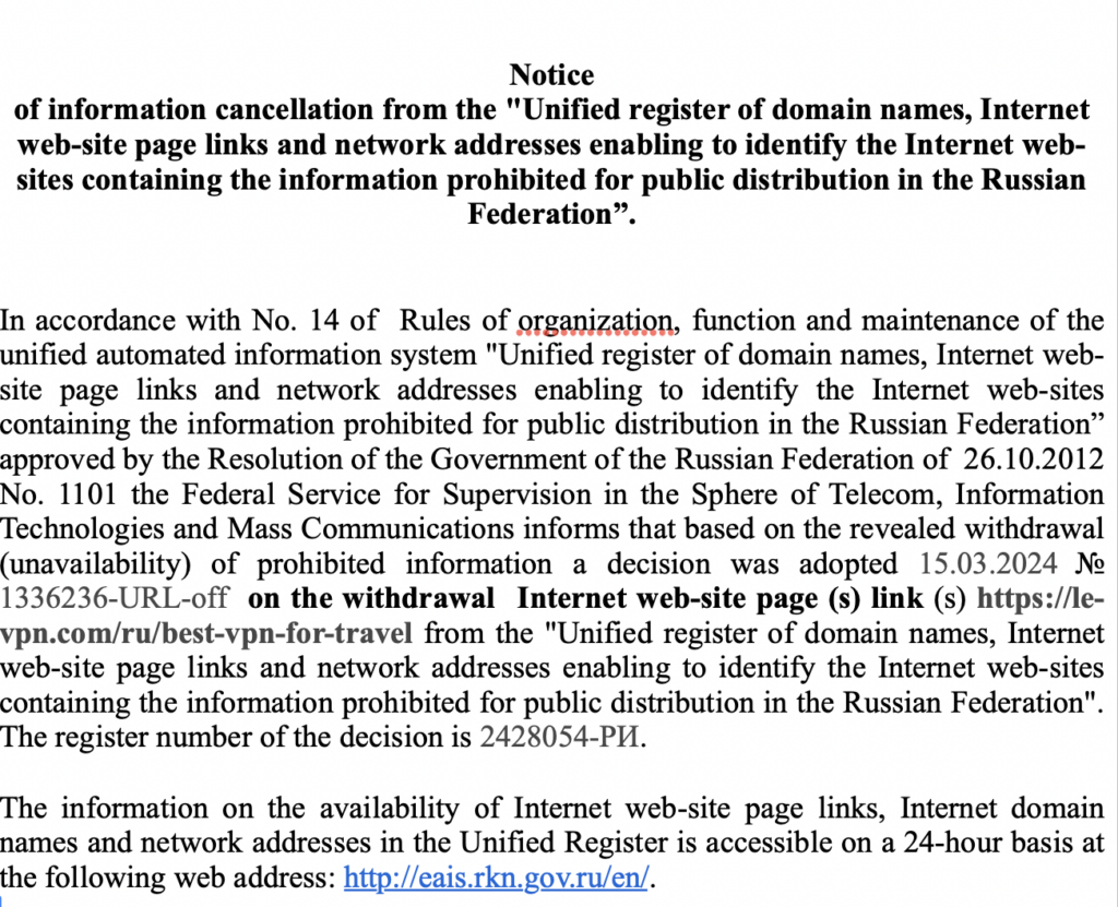 Один из таких противников появился в 2018 году: Роскомнадзор (РКН), российский регулятор связи, который был недоволен ролью Le VPN в обеспечении доступности Telegram в России.